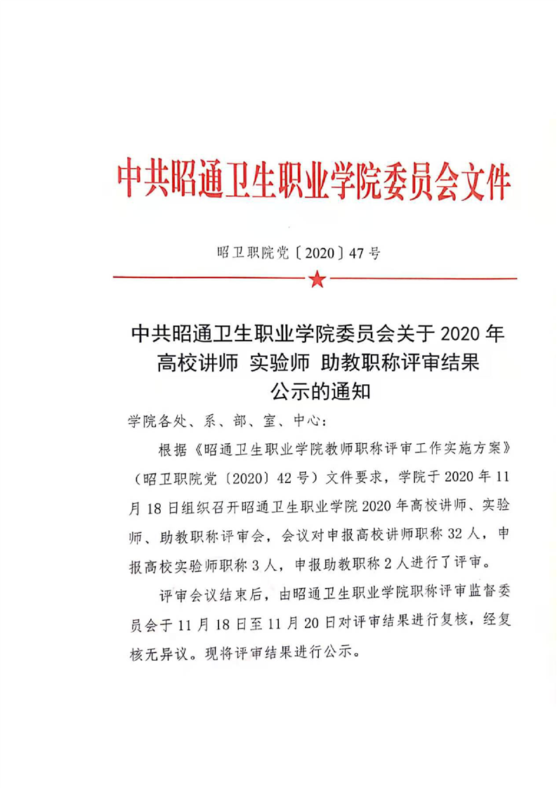 中共昭通卫生职业学院委员会关于2020年高校讲师实验师助教职称评审结果公示的通知