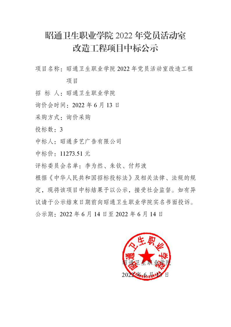昭通卫生职业学院2022年党员活动室改造工程项目中标公示