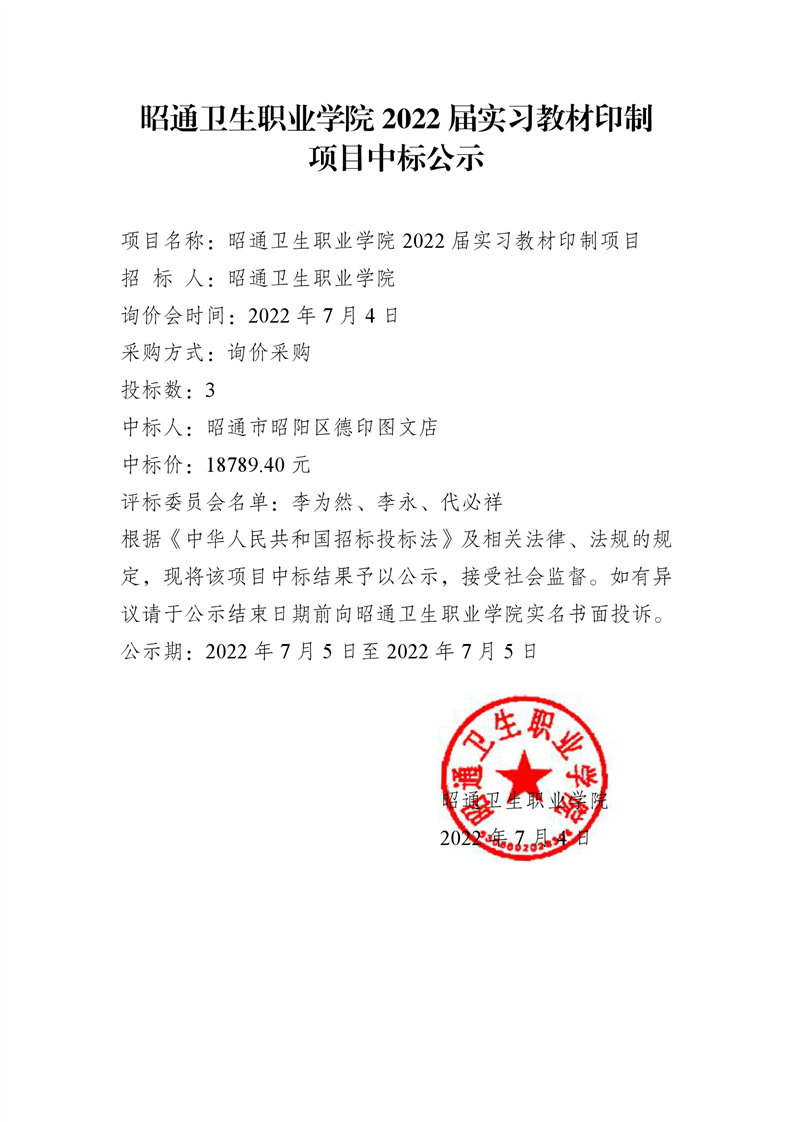 昭通卫生职业学院2022届实习教材印制项目中标公式